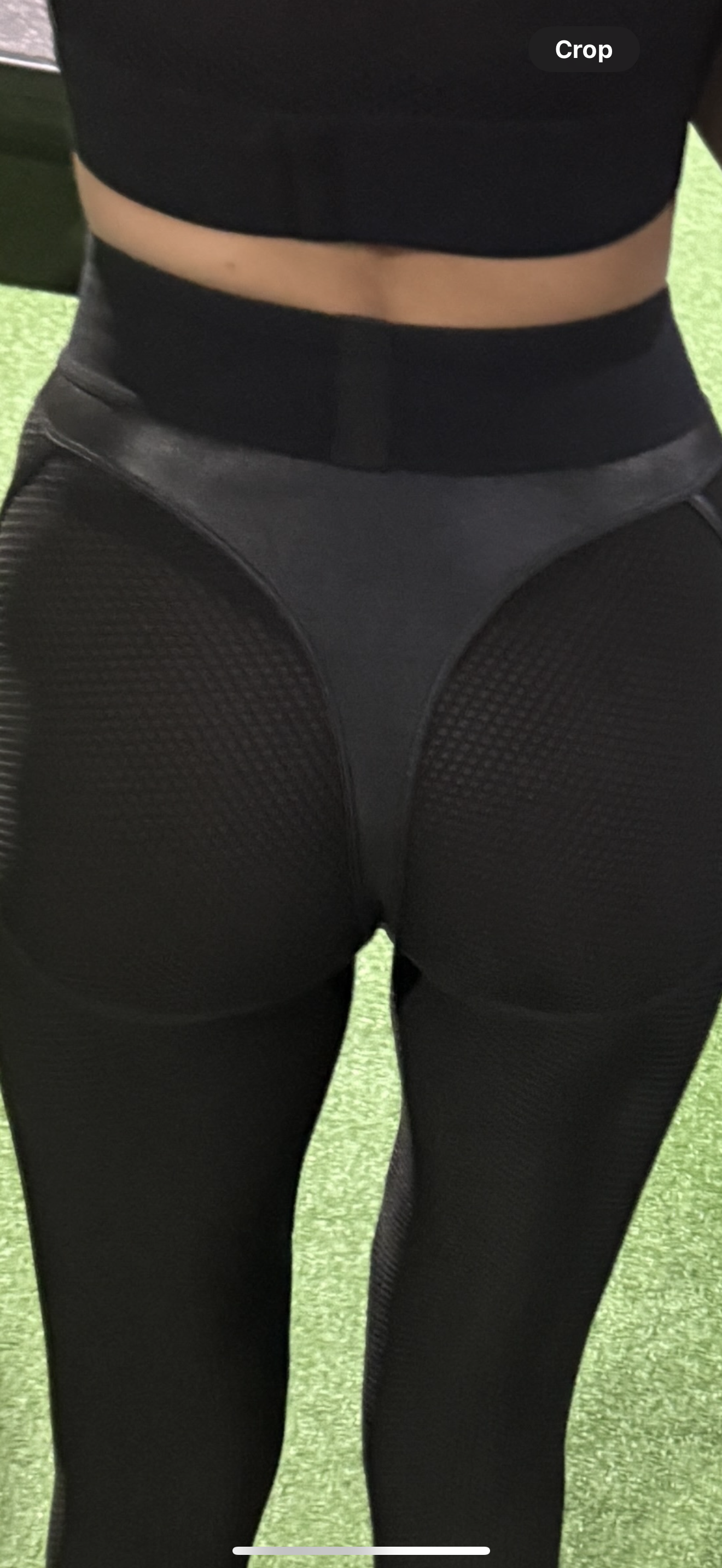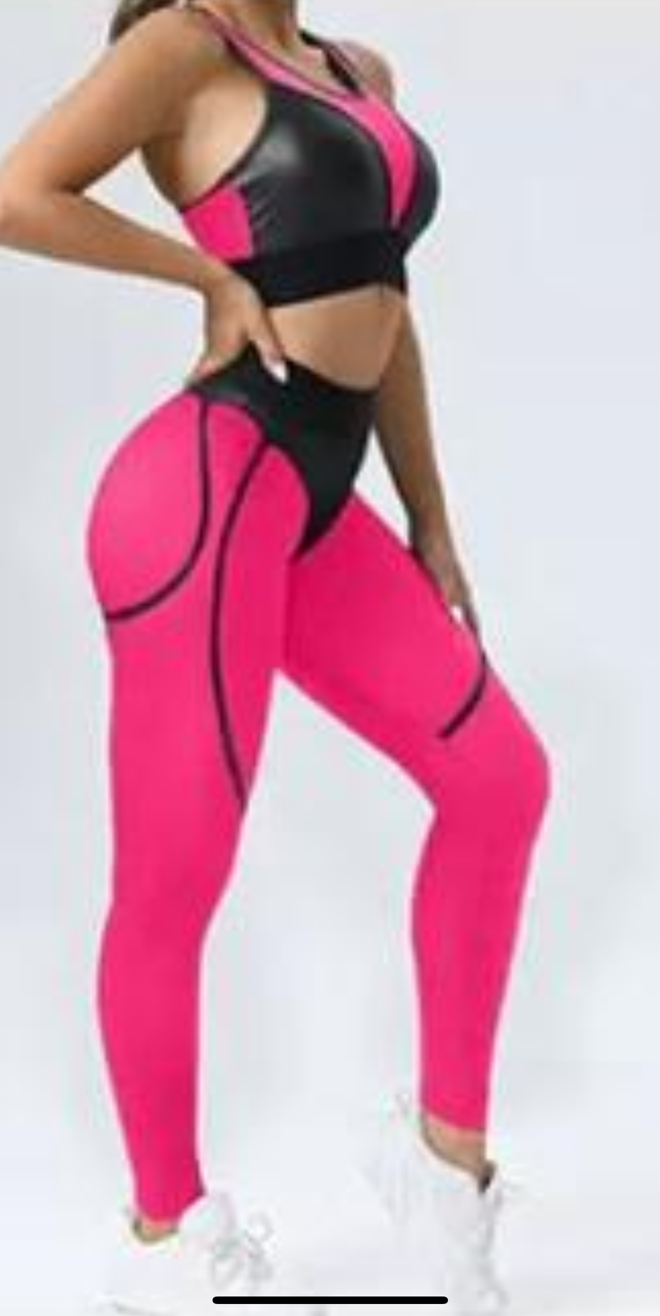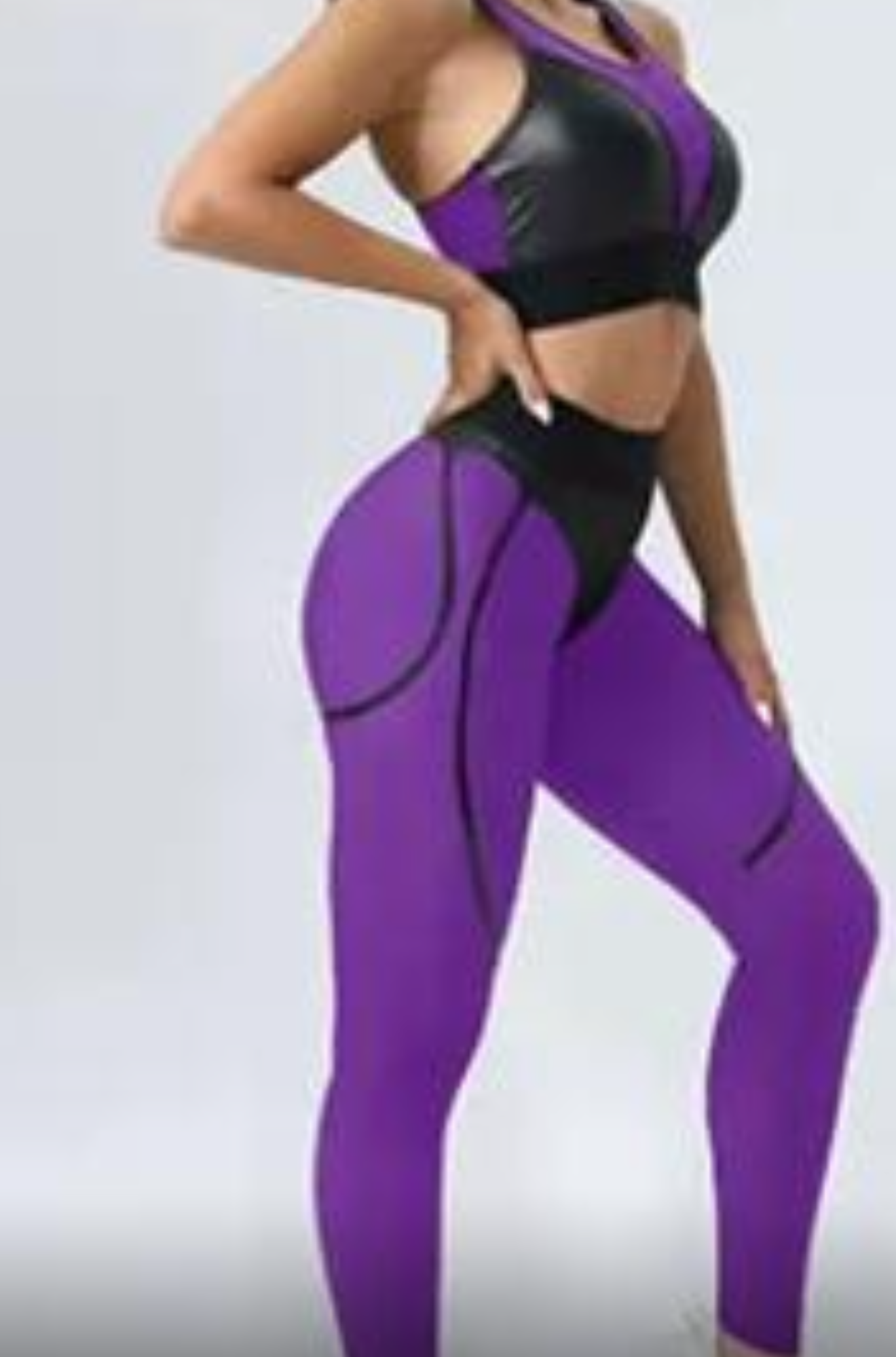 Two piece crop and V shaped leggings with leather cut outs.